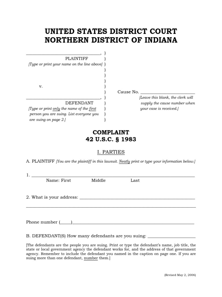 Indiana 1983 Civil Rights Complaint Lawsuit Complaint Free 30day