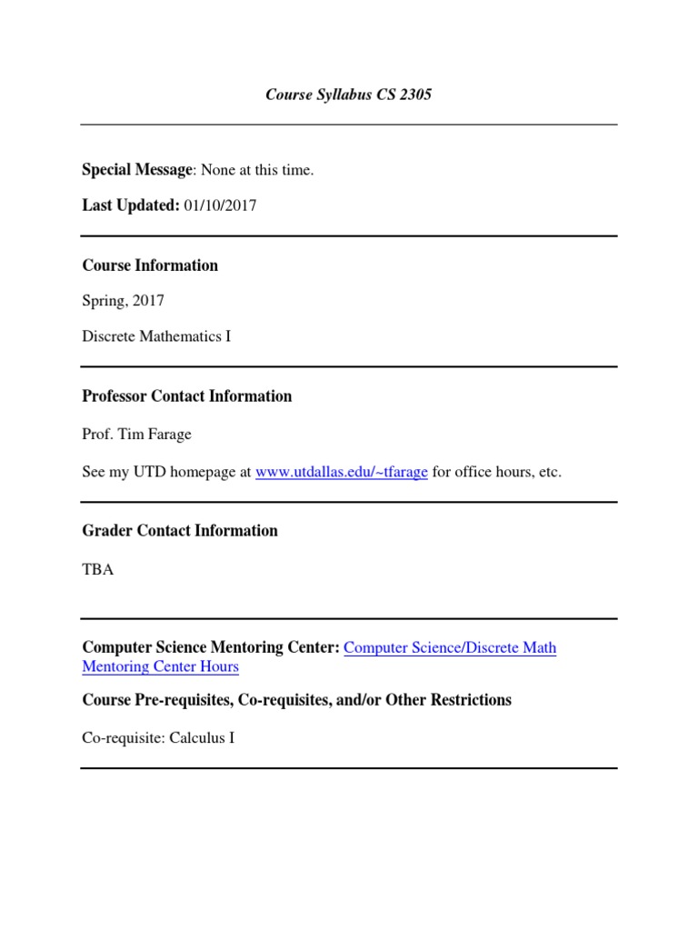 Discrete Math Syllabus - Introduction to discrete structures that are applicable to computer science. We will introduce basic elements of mathematics such as fundamentals of logic, sets and relations, functions, number theory, modular arithmetic,. Learn the basic concepts of logic, sets, functions, graphs, and counting in this course. A course for math majors or prospective math majors. Find out the course description, prerequisites, credits,. Topics include number bases, logic, sets, methods of proof,.