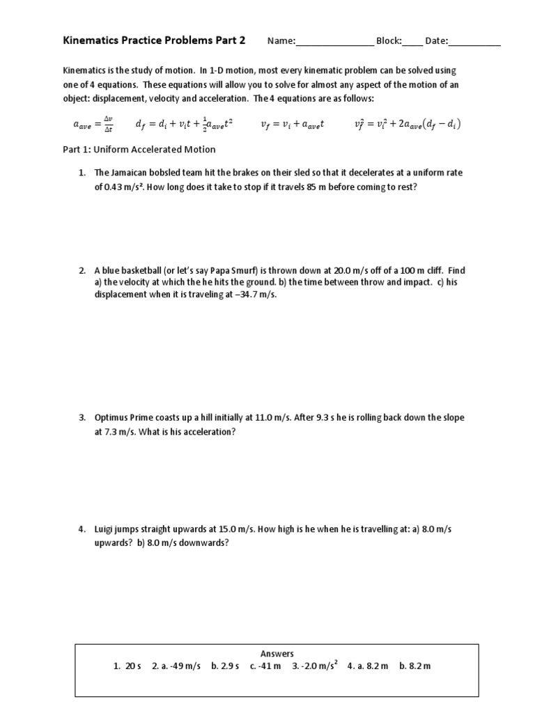 Kinematics Worksheet With Answers