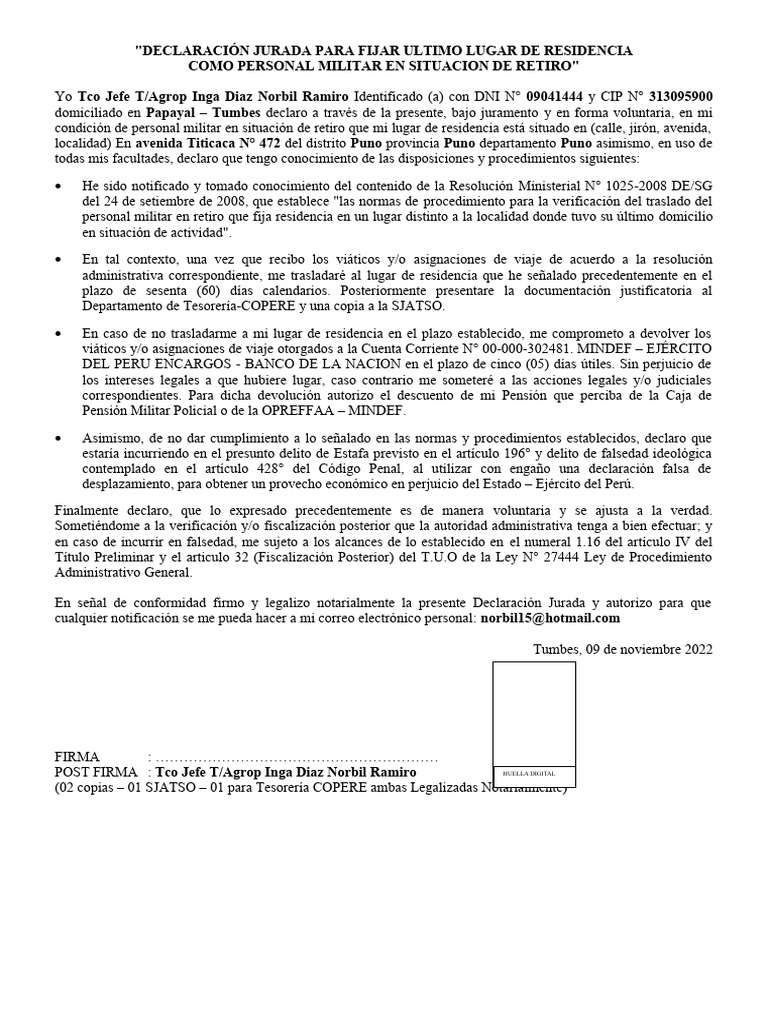 Declaracion Jurada Nueva Residencia Habitual Legalizada Notario Publico