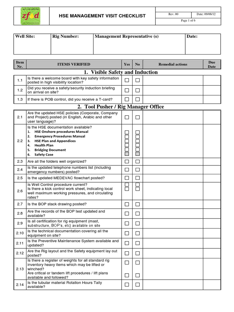 HSE Management Visit Checklist Template Final Manufactured Goods