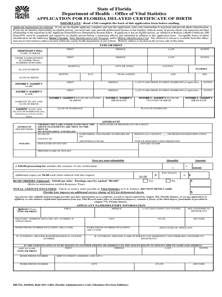 Application For Florida Delayed Certificate of Birth State of Florida