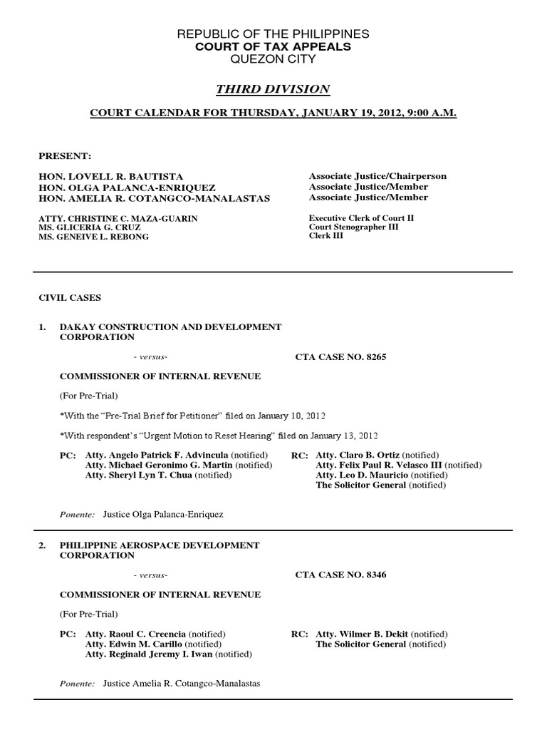 Court Calendar for January 19, 2012 Third Division Session of the Court
